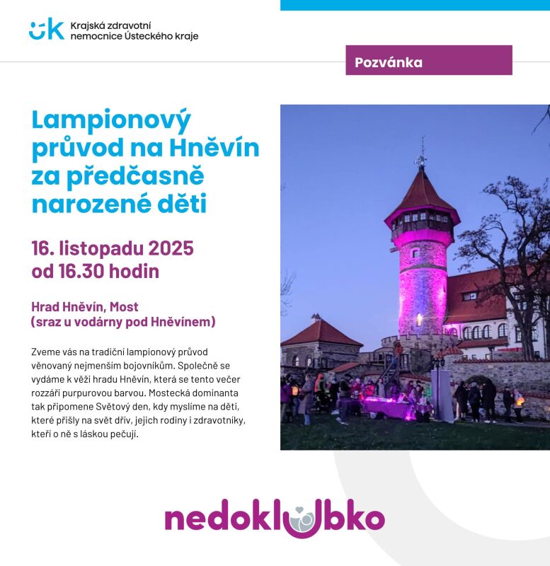 Hrad Hněvín se zahalí do purpurové barvy a připomene Světový den předčasně narozených dětí. Při této příležitosti se 16. listopadu koná tradiční lampionový průvod – světýlková cesta naděje a sounáležitosti. Sraz je v 16.30 hodin u vodárny pod Hněvínem (doporučené parkování) a společně se pak s lampiony půjde ke věži hradu Hněvín, která bude tento večer svítit purpurově.Program na Hněvíně: Vystoupení dětí ze Základní umělecké školy Most pod vedením Terezy Bláhové, taneční vystoupení dětské skupiny The F.A.C.T. pod vedením Julie Koťátkové, drobné občerstvení a teplý čaj, možnost zakoupit si lampion přímo na místě. Kdo chce, může přinést sladkou či slanou dobrotu na společný stůl.