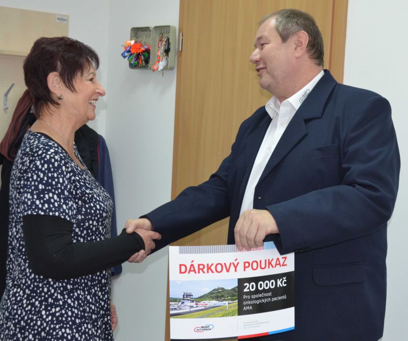 Finanční dar 20 000 korun věnovala společnost AUTODROM MOST neziskové organizaci AMA – SOP, z. s. Most, která poskytuje odborné poradenství onkologickým a postonkologickým pacientům a jejich rodinným příslušníkům. Symbolický šek převzala ve středu 7. února z rukou generálního ředitele autodromu Jiřího Voloveckého předsedkyně společnosti AMA Eva Vrkoslavová. „Pozitivní reakce autodromu nás příjemně překvapila. Podpory si velmi vážíme, peníze využijeme výhradně ve prospěch našich klientů,“ řekla předsedkyně při podpisu darovací smlouvy.