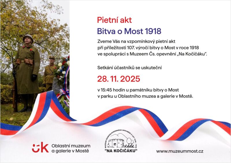 Bitva o Most 1918 Od ink - 23.11.2025 0 2 Pietní akt u příležitosti 107. výročí bitvy o Most z roku 1918 se koná 28. 11. 2025 v 15:45 hod u památníku bitvy o Most v parku u Oblastního muzea a galerie v Mostě.