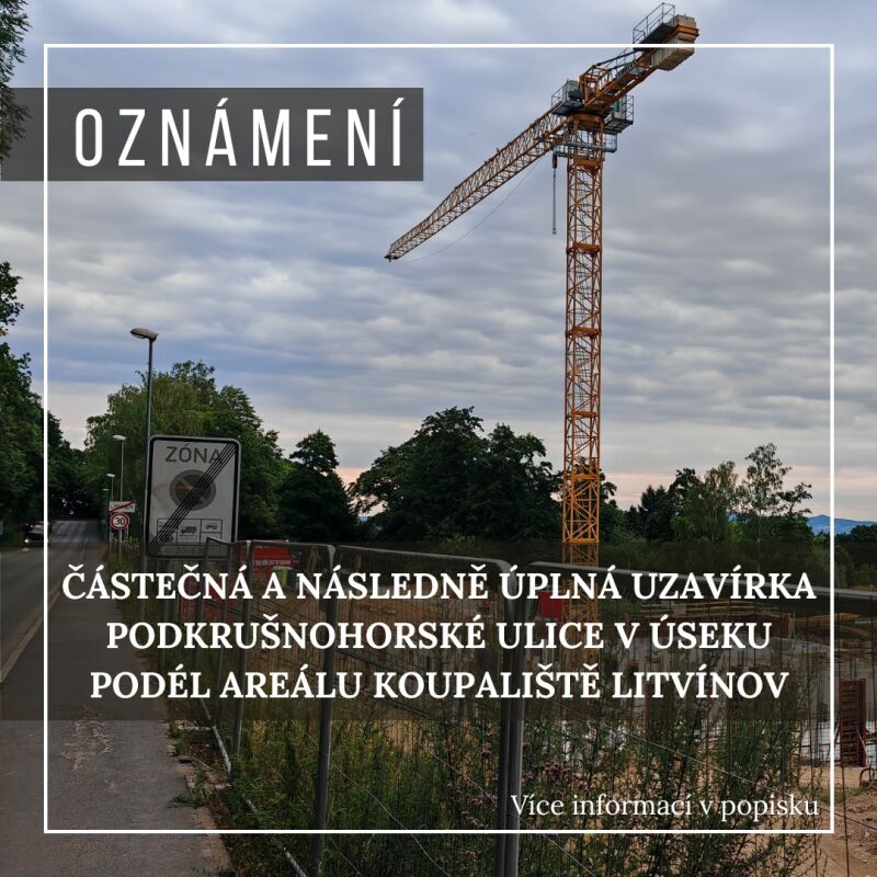 Upozorňujeme na částečnou a následně úplnou uzavírku Podkrušnohorské ulice v úseku podél areálu koupaliště v Litvínově. Omezení proběhne v následujících termínech: