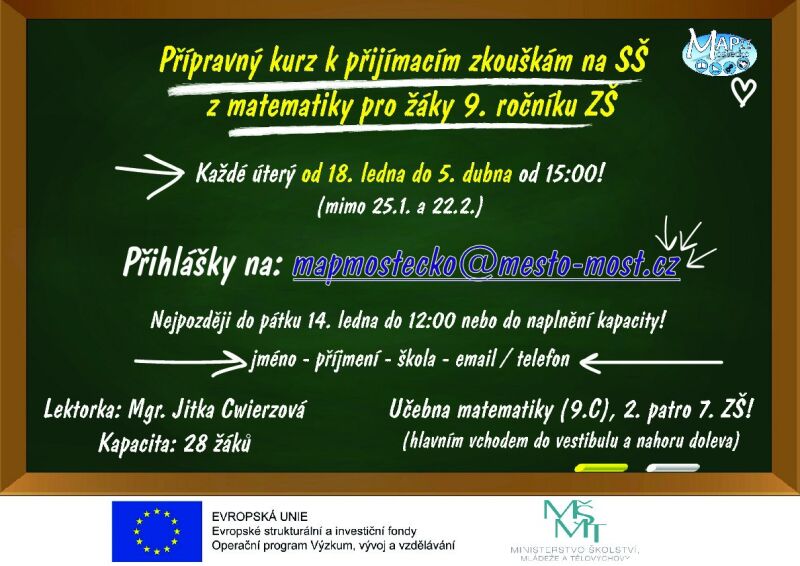 Na 7. Základní škole v Mostě proběhne přípravný kurz k přijímacím zkouškám na střední školy. Za školu se kurzu může účastnit až 5 žáků, další budou evidováni jako náhradníci. Pro přihlášené účastníky je kurz zcela ZDARMA. Více informací v přiloženém letáku.