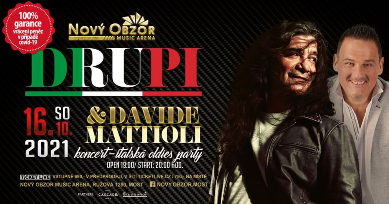 V Music aréně Nový Obzor v Mostě vypukne italská mega oldies párty s největšími hity té doby. DRUPI zazpívá “pecky” jako Piccola e fragile, Sambario, Sereno é, Vado Via a další. Davide Mattioli přidá italské mega hity Mamma Maria, Volare, Felicita atd. Po živáku s kapelou Davide band následuje oldies after párty s DJ až do rána.