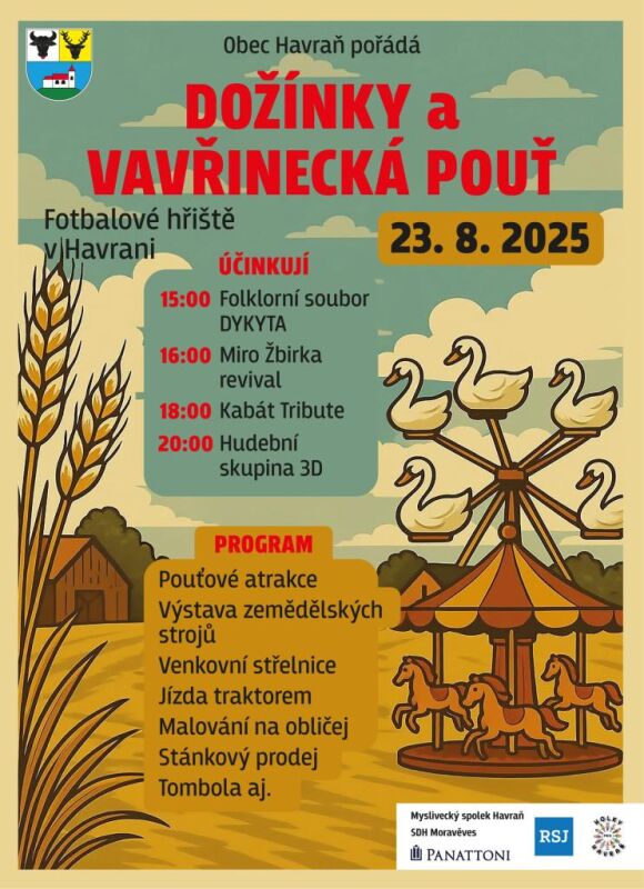 V sobotu 23. srpna se na fotbalovém hřišti v Havrani uskuteční tradiční Dožínky a Vavřinecká pouť, které nabídnou bohatý program. Slavnosti začínají odpoledne v 15:00 hodin.