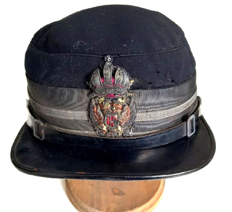 Jednoduchá čapka z tmavě modrého vlněného sukna s koženým pevným štítkem a koženým podbradníkem. Na čelní straně je umístěn vyšívaný rakouský orel, nad ním pak císařská koruna. Čapka je lemována širokým černým hedvábným prýmkem, na kterém jsou umístěny dva kovové prýmky zlaté barvy. Čapka má hedvábnou stélku s nezřetelným znakem firmy (čitelné je pouze slovo Wien/Vídeň). Čapka je jen po základní konzervaci, před restaurováním.