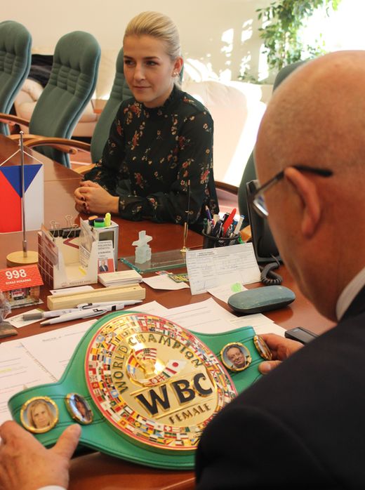 Boxerka přinesla hejtmanovi ukázat pás, který obdržela po vítězném zápase s Angličankou Castleovou.