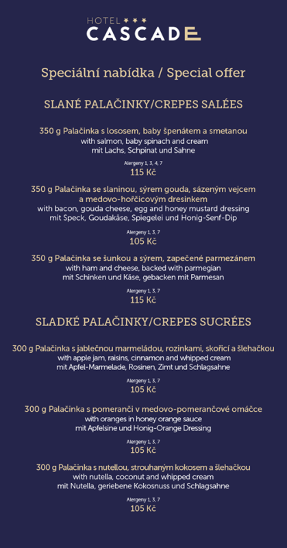 Hotel Cascade zve tento týden na palačinkové speciality Od redakce HL - 17.5.2021 0 1065 Máte rádi palačinky? Pokud ano, vydejte se do mosteckého hotelu Cascade, který tento týden nabízí několik druhů sladkých i slaných palačinek za příznivé ceny. Zapít je můžete třeba některou z našich domácích letních limonád.