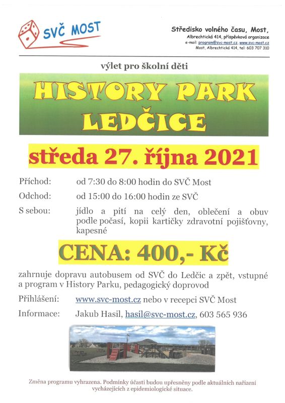 Pro děti, které mají ve středu 27. října prázdniny, chystá Středisko volného času v Mostě  výlet do History Parku Ledčice; přihlášky dostanete v recepci SVČ nebo na https://www.svc-most.cz/akce/967-vylet-history-park-ledcice.
