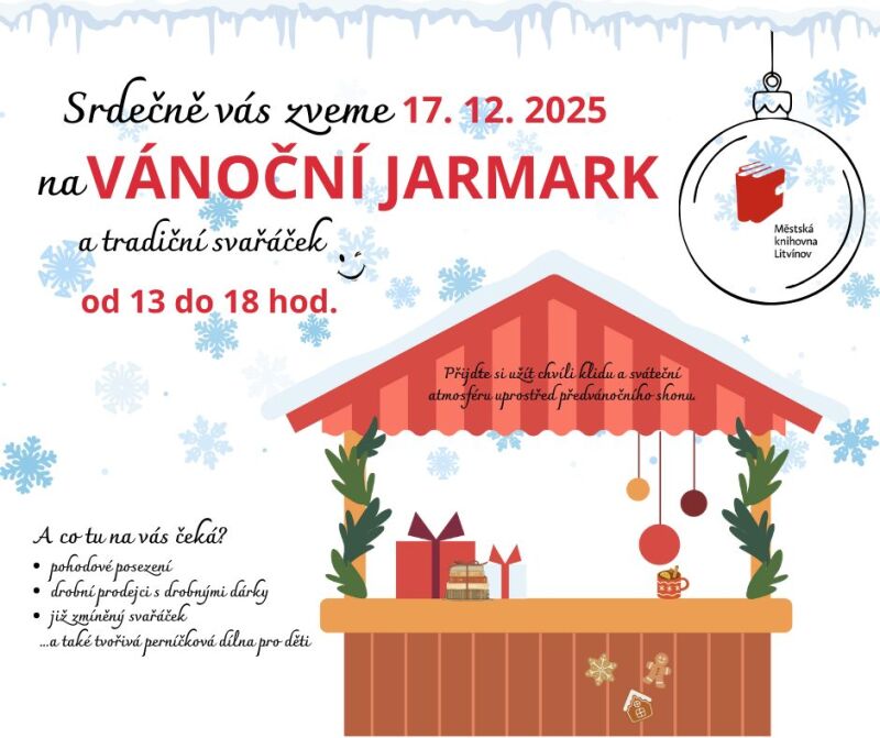 Litvínovská knihovna zve 17. prosince od 13 do 18 hodin na pohodové odpoledne do Městské knihovny Litvínov. Těšit se můžete na drobné dárky, tvořivou perníčkovou dílnu pro děti a samozřejmě na tradiční svařák. Nebude chybět ani vánoční cukroví a milá setkání, která zahřejí na duši. Přijďte si odpočinout od shonu a užít si sváteční pohodu v kruhu zdejší přátelské komunity a našich milých knihovníků.