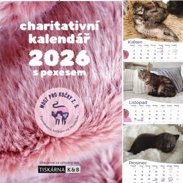 Velký nástěnný charitativní kalendář 2026 s kočkami z Mostu je již v prodeji. Stejně jako vloni v něm najdete i oblíbené kočičí pexeso. Cena kalendáře je 299 Kč, předání je možné osobně v Mostě a v Litvínově nebo ho lze zaslat přes Zásilkovnu. Zájemci se mohou hlásit do komentáře pod příspěvek na Facebooku Most pro kočky. Následně vás bude kontaktovat Petra Supermáma, se kterou domluvíte podrobnosti. Koupí kalendáře pomáháte kočkám, které to nejvíc potřebují. Díky příspěvkům dárců dostávají domovy, péči a naději.