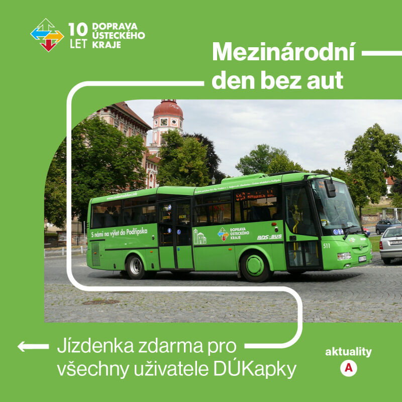 Mezinárodní den bez aut Od ink - 20.9.2025 0 330 V pondělí 22. 9. 2025 všichni uživatelé dopravní aplikace DÚKapka dostanou celodenní síťovou jízdenku zdarma, která bude platit ve vlacích, autobusech a integrovaných MHD i na lodích po celém Ústeckém kraji.