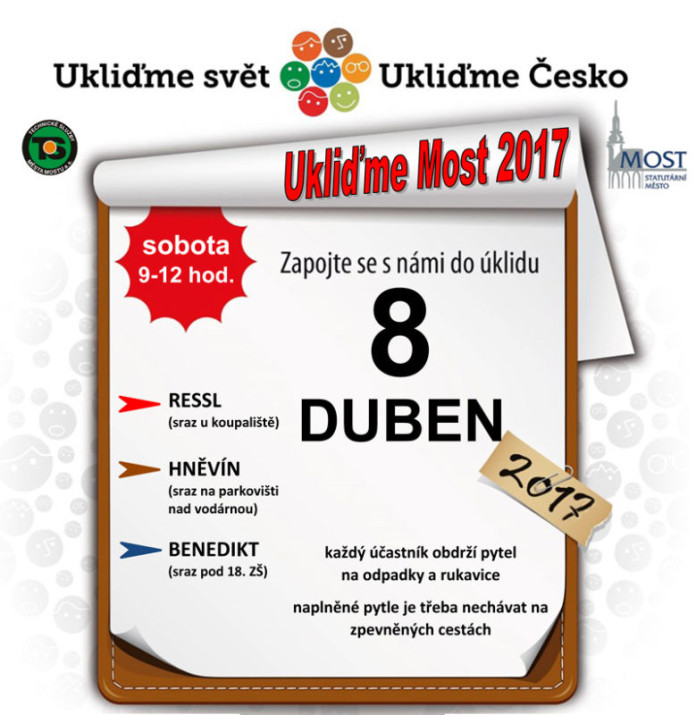 Město Most se letos opět připojí k mezinárodní dobrovolnické akci Ukliďme svět/Ukliďme Česko 2017. Akce proběhne dne 8. dubna od 9 do 12 hodin.