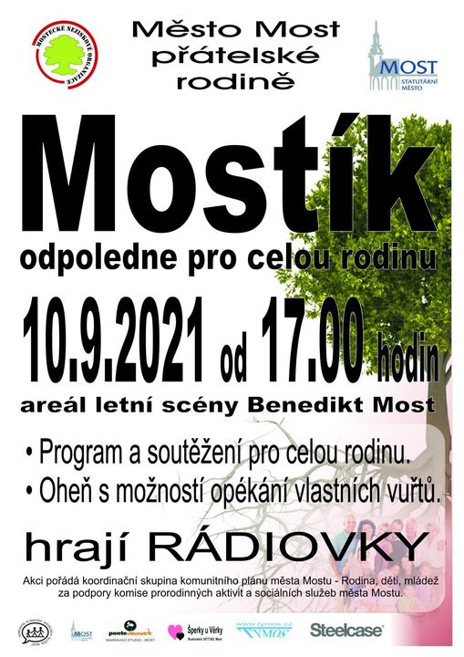 Na Benediktu si dnes můžete užít MOSTÍK, odpoledne pro celou rodinu Od redakce HL - 10.9.2021 0 943 Do areálu letní scény na mosteckém Benediktu se v pátek 10. září od 17 hodin můžete vypravit na rodinnou akci MOSTÍK. Připraven je bohatý program pro rodiny s dětmi. Soutěže, hudba, opékání (vlastních) vuřtů a k tomu všemu zahraje kapela Rádiovky.