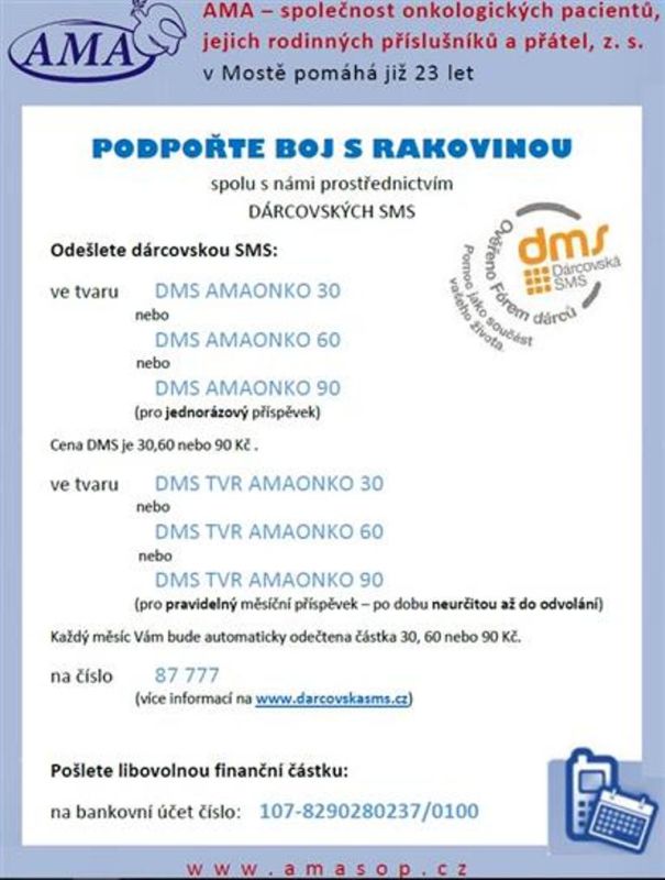 Mostecká neziskovka AMA – Společnost onkologických pacientů, jejich rodinných příslušníků a přátel působí v Mostě již 23 let. Jejím cílem je otevřít všem onkologickým pacientům nové obzory a možnosti a všemožně jim i jejich rodinným příslušníkům pomáhat v jejich nelehké situaci. Jejich služby je možné podpořit i formou DMS.