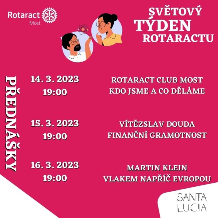 Rotaract club Most jsme připravili několik akcí. V sobotu 11.3. se bude uklízet řeka Bílina, která protéká Mostem. Na tento úklid budeme mít materiál (rukavice, pytle a svoz) zajištěný díky Povodí Ohře. Během týdne proběhnou přednášky na tři různá témata v prostorách St. Lucia – Kasárna Most vždy od 19.00. Na první přednášce 14. 3. své činnosti představí právě mostecký Rotaract, 15. 3. proběhne vzdělávací přednáška o finanční gramotnosti od Vítězslava Doudy a poslední přednáška bude 16. 3., která bude mít cestovatelský nádech a přiblížení programu DiscoverEU od Martina Kleina.