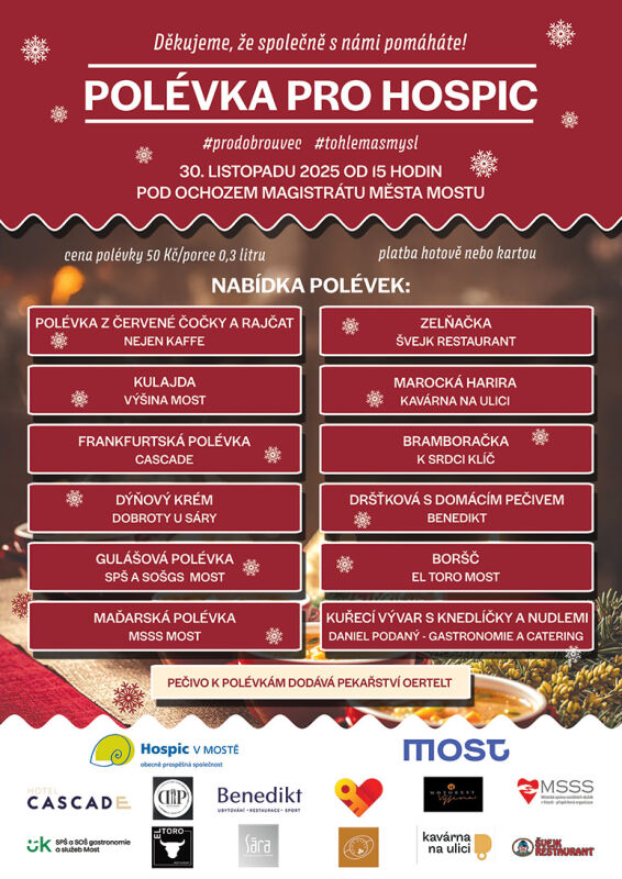 Od 15:00 hodin až do vyprodání vás tu čeká cca 900 porcí poctivých polévek – 12 druhů, vůně, která vás zahřeje, a hlavně smysl, který přesahuje talíř. Cena jedné polévky je 50 Kč, ale pokud budete chtít přidat něco navíc, nikdo se zlobit nebude. Platba možná v hotovosti i kartou.