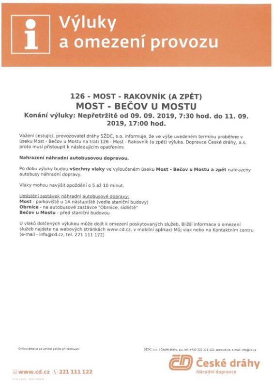 Pozor: Blíží se vlaková výluka mezi Mostem a Rakovníkem Od redakce HL - 5.9.2019 0 1144 V pondělí 9. 9. 2019 od 7:30 do středy 11. 9. 2019 do 17 hodin proběhne vlaková výluka na trati Most – Rakovník a zpět a Most – Bečov u Mostu. Výluka bude nepřetržitá. Pro cestující je připravena náhradní autobusová doprava.