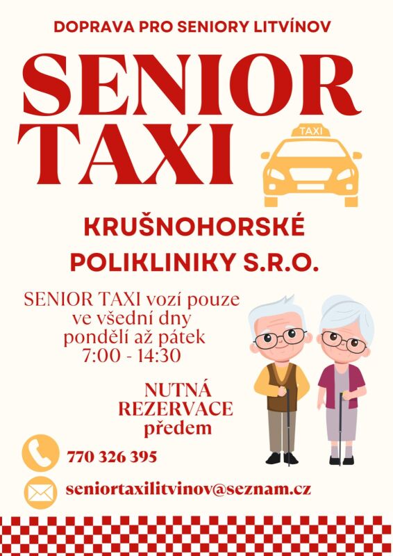 Senioři v Litvínově mají své taxi Od ink - 23.9.2025 0 407 Po celém Litvínově se nově senioři dostanou jen za padesát korun. Krušnohorská poliklinika pro ně připravila senior taxy. Službu, která seniorům usnadní cestování.