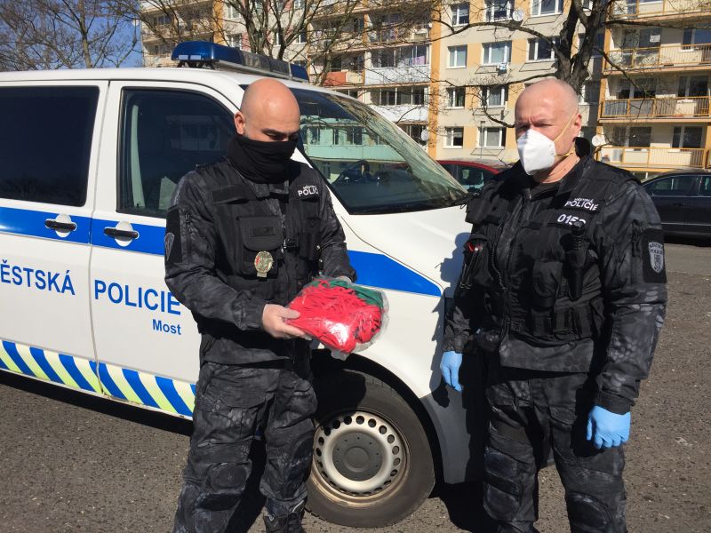 Hlídku strážníků mostecké městské policie překvapili lidé z mongolské komunity. Přišli jim darovat roušky, které šijí a obdarovávají jimi nemocnici, magistrát a další potřebné. Roušky, které hlídce předali, jsou prý pro jejich kolegy na městské policii. „Příjemně nás to překvapilo. Moc za roušky děkujeme, rozdáme je našim strážníkům a kolegům, protože jich máme také nedostatek,“ komentovali překvapivý a milý dárek Miroslav Pokorný a Miroslav Věteovec z Městské policie Most.