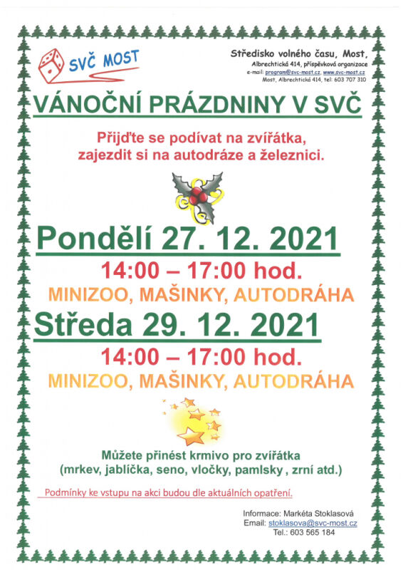 Středisko volného času je 27. a 29. prosince otevřeno Od redakce HL - 27.12.2021 0 993 Středisko volného času v Abrechtické ulici bude otevřeno i o vánočních prázdninách. Děti mohou přijít mezi svátky 27. a 29. prosince vždy od 14 do 17 bude otevřena Minizoo, autodráha a modelová železnice. Krmení pro zvířátka je vítáno.