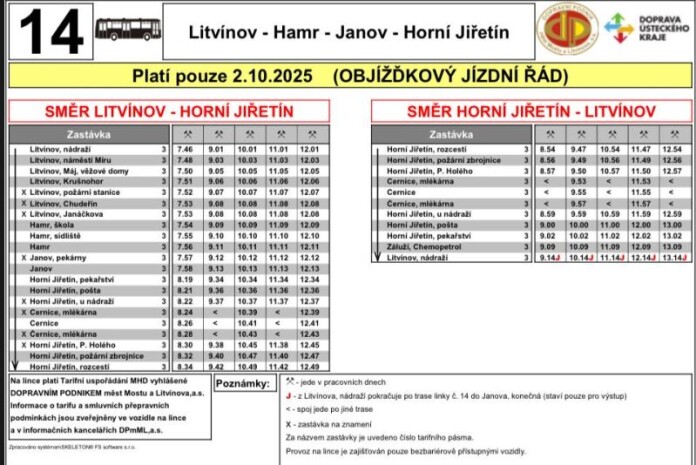 V úseku Janov – Horní Jiřetín a zpět bude provoz na lince č. 14 zajišťován podle objížďkového jízdního řádu.