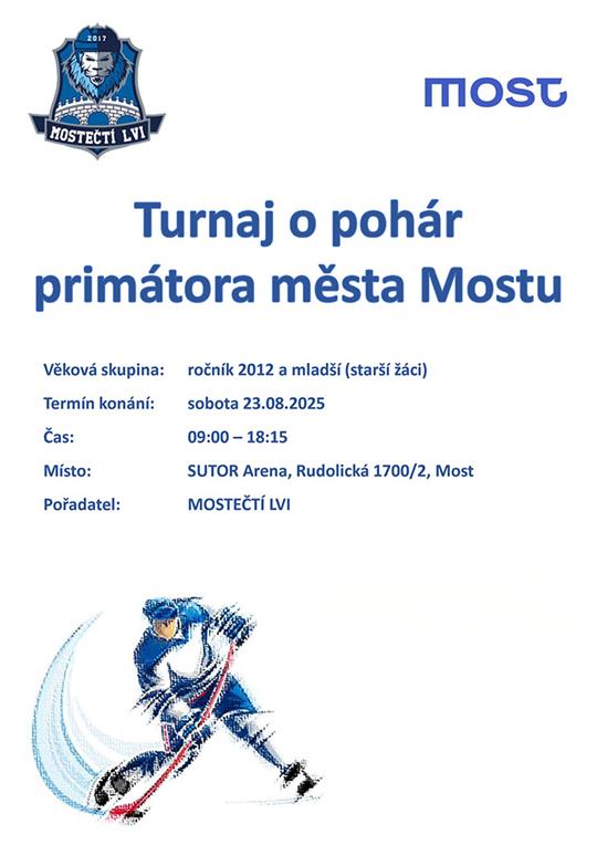 MOSTEČTÍ LVI srdečně zvou všechny fanoušky ledního hokeje na Turnaj o pohár primátora města Mostu. Přijďte podpořit mladé hokejové talenty a užít si den plný sportovních výkonů, emocí a týmového ducha, a to 23. 8. na zimní stadion v Mostě do Sutor Areny, a to v čase od 9 do 18.15 hodin.