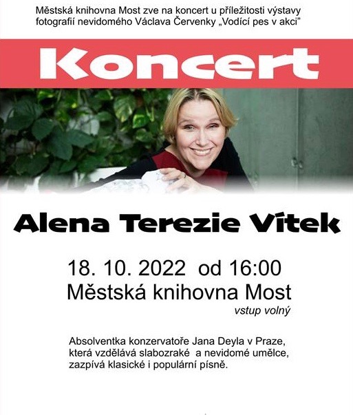V mostecké knihovně zazpívá 18. října Alena Terezie Vítek Od redakce HL - 18.10.2022 0 888 Městská knihovna Most bude 18. října od 16 hodin hostit zpěvačku Alenu Terezie Vítek, která vzdělává slabozraké a nevidomé umělce. Vystoupení se koná k příležitosti výstavy nevidomého Václava Červenky „Vodící pes v akci“.