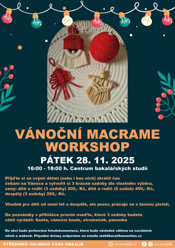 Přijďte si zpříjemnit čekání na Vánoce a vytvořte si 3 originální ozdoby dle vlastního výběru. Přijít můžete se svými dětmi nebo si na chvilku odpočinout i bez nich.