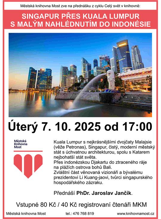 Zavítejte z mostecké knihovny do Singapuru nebo Kuala Lumpur Od Vlasta Šoltysová - 7.10.2025 0 38 Singapur přes Kuala Lumpur s malým nahlédnutím do Indonésie. Nenechte si ujít zajímavou přednášku Jaroslava Jančíka, která se uskuteční v úterý 7. října od 17 hodin v Městské knihovně v Mostě.