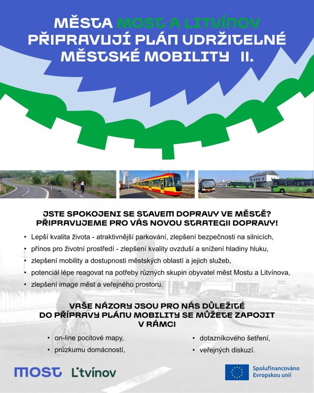 Města Most a Litvínov ve spolupráci se společností CityTraffic zahájila přípravu Plánu udržitelné městské mobility II, jehož cílem je nastavit dlouhodobou a vyváženou strategii rozvoje dopravy v území s důrazem na kvalitu života, bezpečnost, dostupnost a šetrnost k životnímu prostředí.