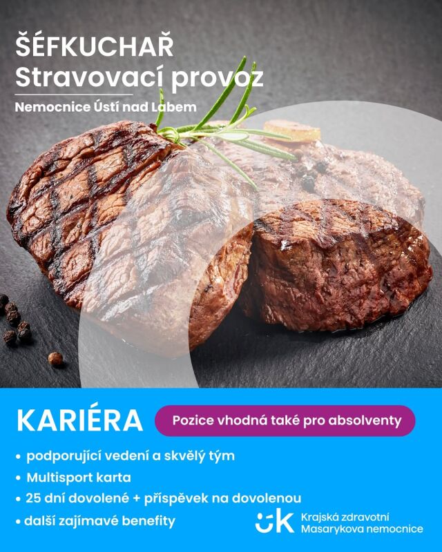 Krajská nemocnice hledá do Ústecké nemocnice vášnivého šéfkuchaře, který rozvoní kuchyně a promění každé jídlo v poctivý zážitek. Zaměstnavatel nabízí stabilní prostředí, přátelský tým a možnost ovlivnit jídelníček stovek lidí, kterým záleží na kvalitě i srdci v kuchyni. Máte chuť posunout nemocniční stravování na novou úroveň? Přidejte se do týmu!