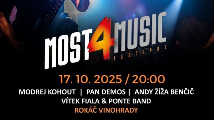 v mosteckém Rokáči Vinohrady se v pátek 17. října rozezní tóny již 17. ročníku minifestivalu Most for Music. Těšit se můžete na energické vystoupení kapely Modrej Kohout, speciálního hosta Andy Žížu Benčič a skvělou show kapely Pan Demos. A to není vše. Večer zakončí Vítek Fiala s kapelou Ponte band.